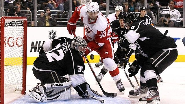 During an eventual 5-2 victory over the Red Wings Tuesday night, I finally caught Carter in person. He stood out for a variety of reasons: He wears the no. 77 jersey (a number that just pops); he's bigger than every relevant King except Kopitar and fan unfavorite Dustin Penner (who might be made of Krispy Kreme); he's one of those natural scoring predators who circles the net with extra purpose; he's a much smarter passer than I expected (hockey's like basketball — the good passers just jump out at you); he kills penalties (something this casual hockey fan didn't expect); and basically, you notice him every time he's skating around. That's an underrated quality for an 82-game season, if only because every team needs a couple of guys who make you say, "Hey, it's that guy! He might do something!" just to keep you on your toes. Carter also tipped the scales for the Kings in this respect: Now that they have two scoring lines, it's easier for them to score (glad I'm here to point this out) and creates a different level of pressure.